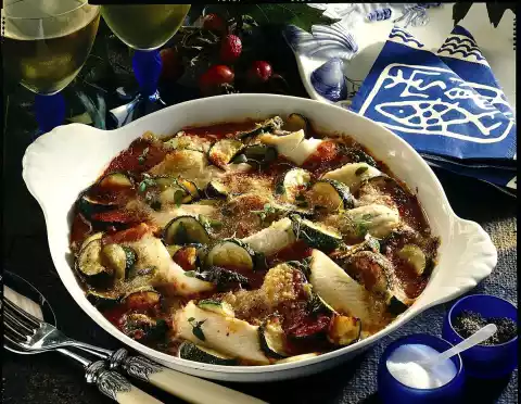 Season to taste with salt and pepper. Put the plaice fillets in a greased baking dish and spread the courgette vegetables over them. Mix parmesan and breadcrumbs and sprinkle over the casserole. Spread the fat in flakes on top.