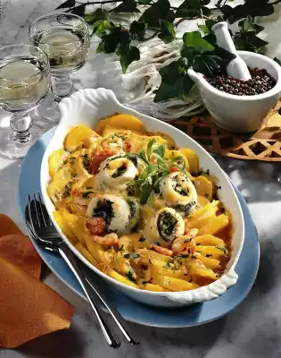 Place the potatoes and plaice rolls in a greased, ovenproof dish. Sprinkle the remaining shallots and tarragon mixture over the potatoes. Pour cream sauce over them and sprinkle with shrimps. Bake in the preheated oven (electric cooker: 225 ° C/ gas: level 4) for about 15 minutes.