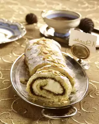 Remove the sponge cake from the oven and turn out onto a tea towel sprinkled with sugar. Remove the baking paper. Roll up the sponge cake from the long side with the cloth and chill. Whip the cream until stiff, adding vanillin sugar and cream firming agent. Unroll sponge roll and spread with plum jam. Spread the cream on top and leave a margin of about 1 cm at the outer/upper end. Roll w