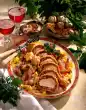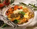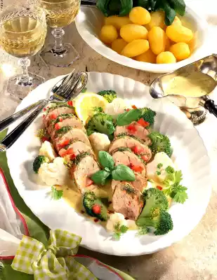 Brown the breadcrumbs in it. Add tomato cubes and herbs. Spread on the fillets. Cut the fillets open and arrange with the vegetables and sauce. Serve garnished with fresh herbs and lemon.