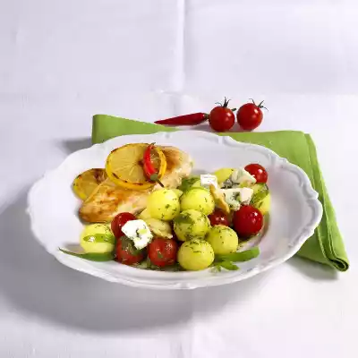 Wash the potatoes and cook for 15-20 minutes in boiling water. Then rinse with cold water, peel and leave to rest. Clean and wash the tomatoes. Cut cheese into small pieces. Wash herbs, chop roughly.