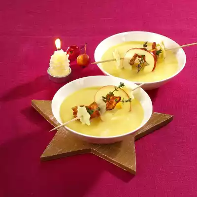 In the meantime, fry bacon in a coated pan until crisp and drain on kitchen paper. Wash the remaining apple, rub dry and cut into slices. Cut out stars as you like and sprinkle with remaining lemon juice. Finely puree the soup, add cream and season to taste with salt and pepper. Spread the bacon, apple stars and apple slices on the wooden skewers and arrange on the soup bowls. Serve garnished with thyme