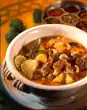 Peel, wash and chop the potatoes. Lift out chicken and breasts and let them cool down for the rice salad. Sieve the stock and put it back into the pot. Simmer the potatoes for about 15 minutes. After about 10 minutes, remove a large skimmer and remove the potato cubes.