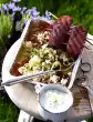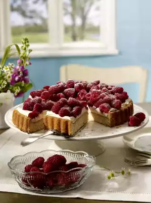 Squeeze orange. Mix orange juice and liqueur. Sort raspberries. Stir mascarpone, sugar and 3 tablespoons orange juice mix until smooth, then stir in the quark. Sprinkle the rest of the orange juice mix on the fruit base, then spread the cream on top. Spread raspberries on top and chill for about 10 minutes. Dust with icing sugar before serving