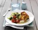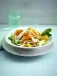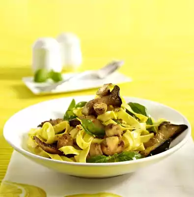 Meanwhile, wash the basil, shake dry and pluck the leaves from the stalks. Sauté the garlic briefly in the frying fat. Add mushrooms and season with salt, pepper and lemon juice. Mix in ##noodles## and basil, heat up briefly.