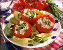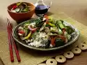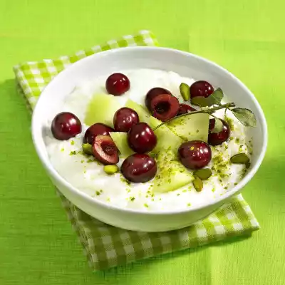 Leave to stand for 10 minutes. Meanwhile peel melon, remove seeds and cut flesh into pieces. Stir the rice pudding again and fill it onto a plate. Mix the fruit and place on top. Serve sprinkled with ground and halved pistachios.