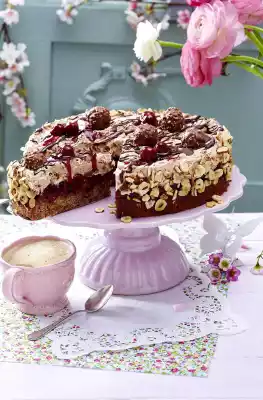 Loosen the cake from the edge with a knife and remove the cake ring / springform pan edge. Press the hazelnut flakes to the edge and spread the chocolate in strips over the cake with a spoon. Decorate with the remaining confectionery balls and cherries.