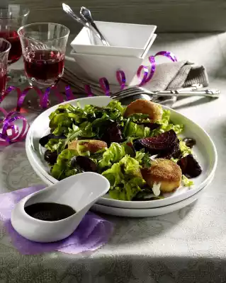 Divide the salad into 4-6 small bowls, drizzle with dressing, spread beetroot on top and place the baked cheese taler on top. Coarsely press the pink berries with a knife blade and sprinkle on the plates.