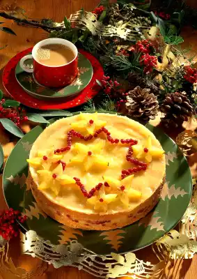 Straighten the top of the cake and cut the cake once. Place a springform pan rim around the bottom base. Take 1-2 tablespoons of the cranberries and mix the rest with 2/3 of the cream. Pour into the springform pan and cover with the second cake layer. Spread the rest of the cream on top and make a star out of the remaining cranberries. Chill for 30-60 minutes. Remove from the mould and decorate with carambola slices as stars. Results in about 16 pieces