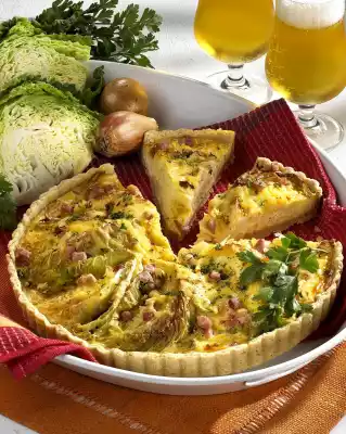 Clean, wash and quarter the cabbage and cut into thin slices or large pieces. Peel onions. Chop onions and smoked pork finely. Fry them in hot oil and take them out. Fry the cabbage in the frying fat on both sides. Whisk sour cream and 4 eggs, season well