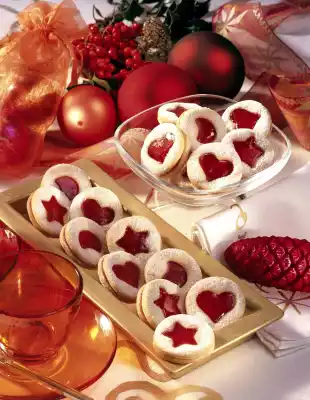 Place the cookies on two baking trays lined with baking paper. Bake one after the other in a preheated oven (electric cooker: 175 °C/ gas: level 2) for 10-12 minutes. Let them cool down. Heat the jelly in a small pot and spread a thin layer of jelly on each cookie, with and without the centre cut out, and put them together. Dust with the remaining diabetic sweetness. Fill the upper cookies with the remaining jelly and let them get firm