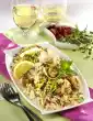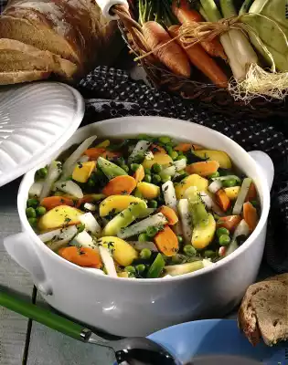 Heat the oil in a pot and fry the onion for about 2 minutes. Add potatoes, carrots, kohlrabi, spring onions and peas and steam for about 5 minutes. Deglaze with the stock and bring to the boil. Cook at low heat for about 20 minutes. Wash thyme and parsley, dab dry and remove leaves from the stalks. Chop parsley finely. Add both to the stew shortly before the end of the cooking time and stir in. Season with salt and pepper. Serve in a terrine.