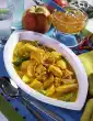 Peel, wash and slice the potatoes. Clean and peel carrots and kohlrabi. Cut carrots diagonally into slices, kohlrabi into sticks. Clean, wash and chop spring onions. Peel and finely chop the onion.