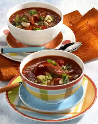 Add tomato paste, sweat briefly, deglaze with stock and pureed tomatoes. Bring to the boil. Simmer at low heat for about 5 minutes. Add beans and sausage 2 minutes before the end of cooking time. Season soup with salt, pepper, paprika and sugar.