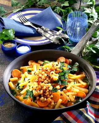 Peel and wash the rutabaga, first cut into slices, then into sticks. Peel the carrots, clean the leek. Wash both and cut into thin slices. Cook prepared vegetables in boiling broth and tomato paste for 20 minutes.