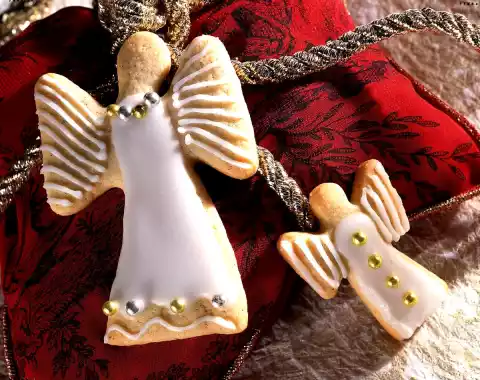 To decorate, mix icing sugar and approx. 2 tablespoons of lemon juice to a thick, sprinkly glaze. Put up to about 60 g in a small freezer bag and cut off a corner. Mix the remaining icing and 1/2-1 tablespoon lemon juice to a spreadable icing. Decorate angel with icing, silver and gold beads as desired. Leave to dry. Results in about 21 large and 30 small angels