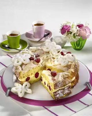 Sprinkle 300 g sugar. Keep beating until the sugar is completely dissolved. Pour 4 tablespoons of meringue into a piping bag with a small star-shaped spout and squirt flowers onto a baking tray lined with baking paper. Spread the rest of the meringue loosely on the dough, leaving about 2 cm of edge free. Bake in a preheated oven (electric range: 175 °C/ convection oven: 150 °C/ gas: level 2) for approx. 35 minutes, then let cool off. Let meringue blossoms dry for approx. 2 hours at 50 °C in the slightly opened oven of the electric cooker. For the filling select raspberries. Put 200 ml cold milk into a mixing cup rinsed with hot water. Add cream powder and mix briefly with the whisk of the hand mixer. Then whip at highest setting for 3 minutes. Carefully fold in 200 g raspberries. Spread on a meringue base and place in a cold room for about 2 hours. (Not in the refrigerator!) Place the second base on top.
