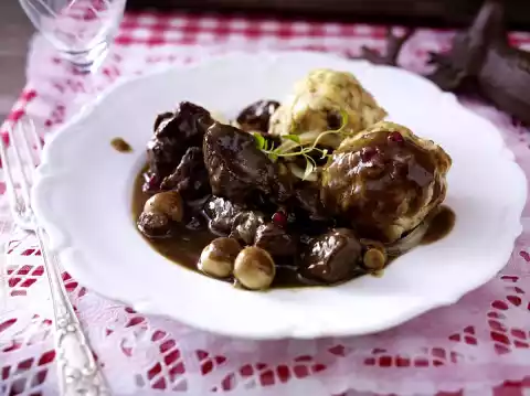 About 15 minutes before the end of the cooking time, add fried mushrooms, chopped porcini mushrooms and remaining onion slices to the goulash. Finely dice the bread roll. Heat the milk, pour over the rolls and let them simmer for about 30 minutes. Finely dice 1 onion. Heat the butter, sauté the onion in it and take it out. Wash the thyme, shake dry, remove the leaves, except for some garnish, from the stalks and chop finely. Add eggs, steamed onion cubes and thyme to the rolls. Knead everything well and season with salt and pepper. Form small dumplings from the bread roll mixture. Put 2 portions into boiling salt water and let them simmer for 12-15 minutes. Keep ready dumplings warm. Stir 2 tbsp. cranberries into the goulash, season to taste with salt, pepper and a little sugar. Whip cream until semi-stiff, stir in 1 tbsp. cranberries. Arrange dumplings, goulash and 1 blob of cream each on plates, garnish with thyme. Add the rest of the cranberry cream