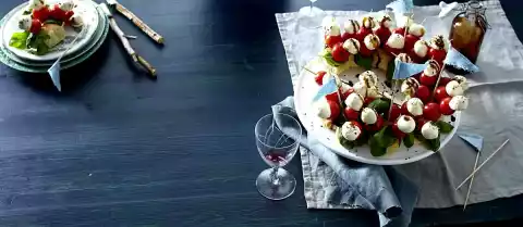 Stick wooden skewers into the wreath. Sprinkle with pepper and sprinkle with balsamic cream.