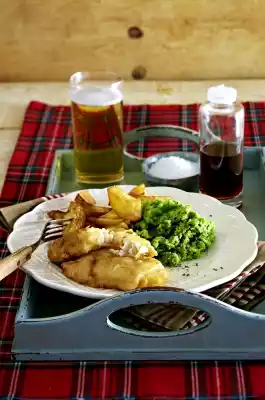 Fry the French fries in portions for approx. 4 minutes each, take them out and let the fat drip off. Season chips with salt. Sprinkle fish with malt vinegar or wine vinegar to taste. Arrange fish with pea puree and chips