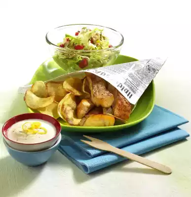 Mix vinegar, 2 tablespoons water, salt and pepper. Fold in the oil. Clean and wash the salad and pluck into pieces. Clean, wash and chop the peppers. Rinse sprouts and let them drip off. Mix salad ingredients and marinade. Season chips with salt, arrange with fish. Add salad and yoghurt sauce