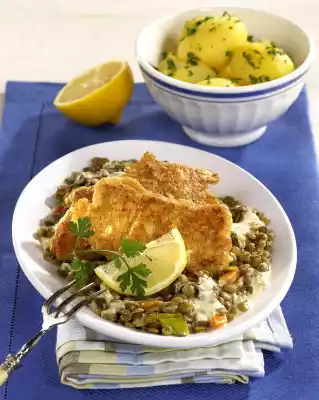 Deglaze with broth, add lentils and cook covered over medium heat for about 35 minutes. In the meantime wash the fish, dab dry and sprinkle with lemon juice. Season with salt and pepper. Put flour, breadcrumbs and eggs in 1 deep plate each.