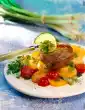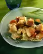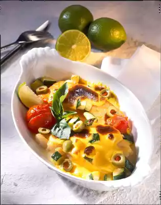 Put 1 salmon and 1 cod fillet each with 2 tomatoes in an ovenproof dish. Sprinkle with about 1/2 of the lime juice. Sprinkle zucchini over it. Heat 1/8 litre water. Stir in sauce powder and bring to the boil.