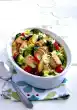 Cover with aluminium foil if necessary. In the meantime, cut the olives into slices. Sprinkle olives on the fish pan and garnish with basil.