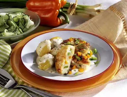 Mix fish, half of the vegetables, 20 g flour and egg. Season to taste with salt, pepper and lemon juice and chill again. Melt the fat in a saucepan. Stir in 30 g flour and sauté briefly. Add milk while stirring, bring to the boil and simmer at low heat for about 5 minutes.