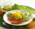 Drain cucumbers and mix with vinaigrette. Form 8 small meatballs from the fish mixture. Heat 2 tablespoons of oil in a pan and fry the meatballs for 2 minutes on each side. At the end of the cooking time, add the remaining vegetables and let them fry.