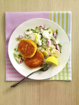 Boil the potatoes in water for 20-25 minutes, then rinse and peel under cold water. Meanwhile clean, wash and quarter the radishes. Wash and clean spring onions and cut them diagonally into rings. Blanch peas in boiling water for 2-3 minutes, then rinse under cold water and drain. Stir yoghurt, tartar sauce and milk until smooth and season to taste with salt and pepper. Cut the potatoes into slices.