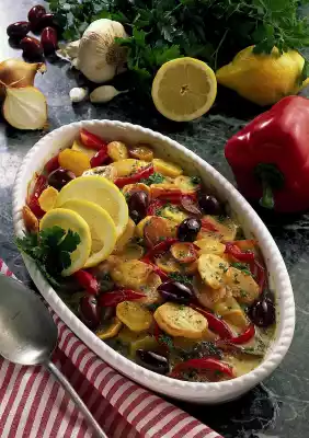 Place on the bottom of the dish. Place slices of ham and cheese on top and pour the sauce over them. Clean, wash and cut the peppers into strips. Spread the paprika and potato slices on the sauce. Bake in the preheated oven (electric cooker 200 ° C/ gas: level 3) for about 25 minutes. Serve garnished with olives, lemon slices and parsley