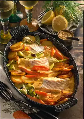 Stir in the sauce thickener, bring to the boil again. Season to taste with salt, pepper and sugar. Cut potatoes into slices. Heat oil in a pan and fry the potatoes until golden brown. Put the vegetables, fish and potatoes in an ovenproof dish.