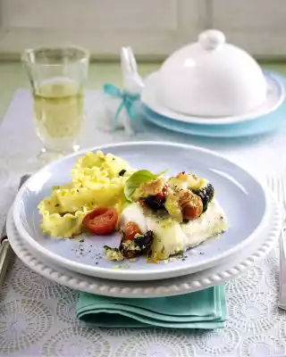Add tomatoes and braise for about 2 minutes. Fold in mozzarella. Wash the fish, dab dry and season with salt. Put them in a flat roasting pan spread with oil. Pour the spinach mixture into a sieve and drain. Collect the stock. Spread the spinach on the fish. Sprinkle with breadcrumbs and spread 1 tablespoon butter in flakes on top. Bake in a preheated oven (electric range: 200 °C/ convection oven: 175 °C/ gas: level 3) for approx. 10 minutes. In the meantime prepare the pasta in boiling salted water according to the instructions on the packet. Bring spinach stock to the boil and reduce to approx. 4 tbsp.