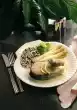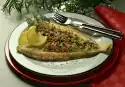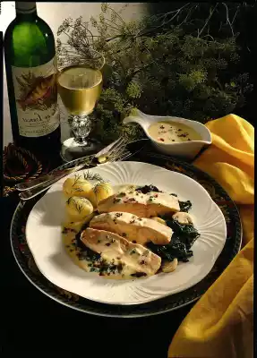 Bring 1/8 litre of water, cream, onion, lemon slices, bay leaf, some salt and pepper to the boil. Let the fish simmer for about 8 minutes. Sauté mushrooms in hot fat. Add spinach and steam briefly.