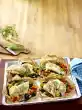 Place 1 piece of fish, vegetables, 2-3 lemon slices and 2 bay leaves on a piece of parchment paper. Season with salt and pepper and wrap up. Place the fish parcels on a baking tray and bake in a preheated oven (electric cooker: 200 °C/ gas: level 3) for 25-30 minutes. Place the herb baguette on the baking tray 8-10 minutes before the end of the baking time and bake to the end. Open parchment paper, sprinkle fish with dill, serve on salad leaves garnished with lemon wheels and dill