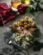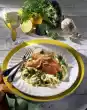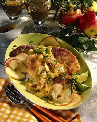 Add mustard-cream sauce and warm up. Roast the mustard seeds in a pan without fat and remove. Heat 1 tablespoon of fat in the pan, add sugar and remaining lemon juice and steam the apple slices for 1-2 minutes. Remove and put aside. Whisk egg, some salt and pepper on a deep plate. Put flour and breadcrumbs on plates as well and turn the drained fish fillets first in flour, then in egg and finally in breadcrumbs. Heat the remaining fat in a frying pan and fry the fish fillets for 3-4 minutes on each side. Wash the chives, dab dry and cut into small rolls. Arrange the fish on a small plate and pour some mustard sauce over it. Sprinkle with chives and roasted mustard seeds. Serve garnished with apple slices, parsley and lime wedges.