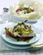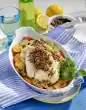 Arrange fish, rice, spring onions and sauce. Spray citrus butter on lemon or grapefruit slices and place on the fish