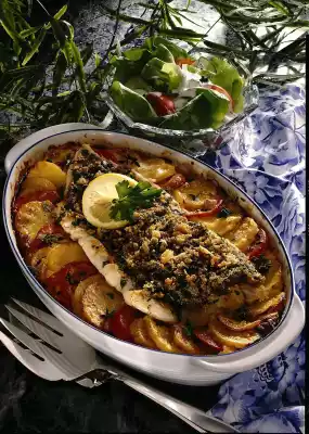 Place the slices one layer higher on the edge. Mix cream and remaining Parmesan, season to taste and pour over the slices. Place the fish fillet in the middle of the dish. Spread the herb mixture over it and press it down a little.