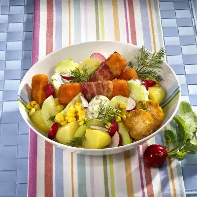 Wash dill, dab dry and chop finely, except for something to garnish. Mix salad cream, milk and dill. Season with salt and pepper. Drain the corn. Mix potatoes, cucumber slices, radishes and corn. Cut bacon in half lengthwise. Wrap 8 fish fingers with one slice of bacon each in the middle. Halve the remaining fish fingers. Heat oil in a large frying pan and fry all fish fingers for 4-5 minutes, turning them over until golden brown.