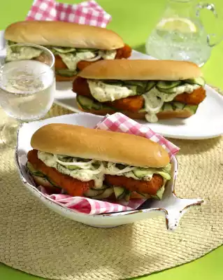 Take out and drain on kitchen paper. Cut the hot dog buns open lengthwise. Cover the bottom half with cucumber salad, 2 fish fingers and 1 tablespoon tartar sauce. Place the upper half on top.