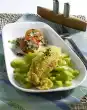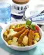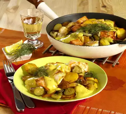 Season with salt. 5 minutes before the end of the cooking time add cucumber and onions to the potatoes. Heat 1 tablespoon of oil in a pan. Fry the fish for about 5 minutes while turning. Add to the fried potatoes.