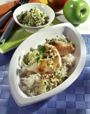 Serve fish and rice with the apple-cucumber salsa.