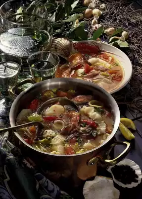 Wash fish and cut into pieces, cut squid into rings. Remove the shrimps from their shells up to the tail. Clean, wash and slice the celery. Peel and chop carrots.