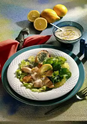Peel the lemon so that the white skin is completely removed. Then cut into thin slices. Mix mayonnaise and yoghurt for the sauce. Season with salt, pepper, sugar and lemon juice. Cut the baguette roll into slices. Spread with remaining fat. Wash the dill and chop except for a few flags for garnishing. Sprinkle on the baguette slices and grill under the hot grill for 2-3 minutes. Arrange everything together on plates.