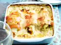Stir the crème fraîche and milk until smooth. Season with salt and pepper and pour over the fish. Grate Gouda and sprinkle with the remaining bacon mixture. In a preheated oven (electric cooker: 175 °C/circulating air: 150 °C/gas: see