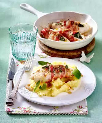 Top the fish pieces with 3-4 sage leaves each, wrap 1 slice of bacon firmly around each. Season with salt, except for the bacon, and pepper. Heat oil in a pan. Fry the fish for 5-6 minutes while turning.