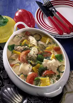 Wash the pollack, cut it into bite-sized pieces, sprinkle with lemon juice and salt. Let the rice swell in boiling salted water for 15-18 minutes. Clean and wash the vegetables. Dice peppers, slice zucchini, cut tomatoes into slices. Heat fat in a pot. Sauté peppers and zucchini. Dust with flour, sweat briefly and deglaze with fish stock. Add cream, bring to the boil and continue cooking for about 5 minutes at medium heat. Let the fish and tomatoes simmer for about 10 minutes. Season to taste with salt, pepper and lime juice. Wash lemon balm and cut into fine strips. Before serving, sprinkle the ragout with lemon balm and, if desired, julienne. Serve with rice