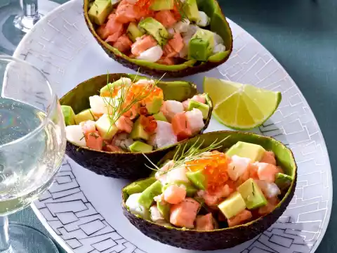 Wash the dill and cut the flag of 1 stalk into small pieces, mix under the tartar. Spread the fish tartare over the avocado halves. Garnish with salmon caviar and remaining dill. Arrange lime corners and peel and serve immediately