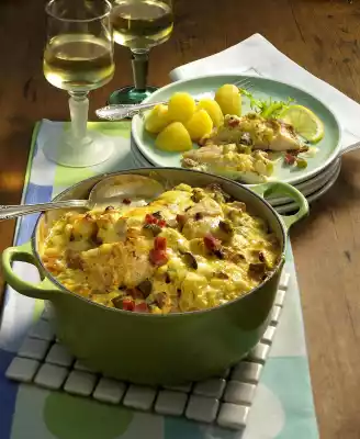 Season to taste with Madeira, salt, pepper and sugar. Spread the mixture over the fish. Sprinkle with Gouda. Bake in the preheated oven (electric cooker: 175 °C/ convection oven: 150 °C/ gas: level 2) for about 30 minutes. Serve garnished with lemon slices and salad. Boiled potatoes taste good with it